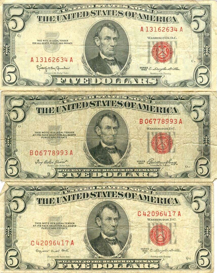1963 $5 VG/XF Red Seal Note Lot of 3.