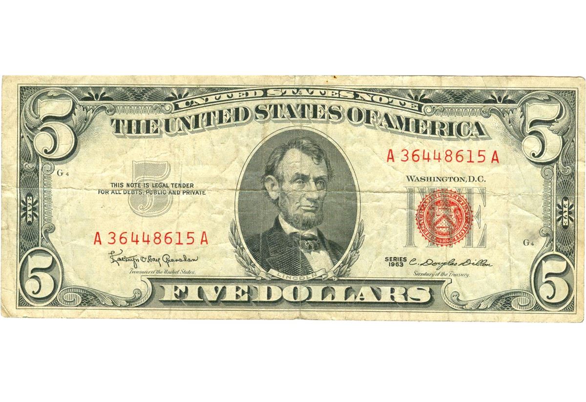 1963 $5 VG/XF Red Seal Note.