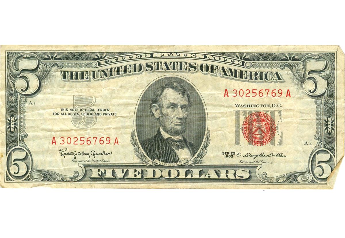 1963 $5 VG/XF Red Seal Note.