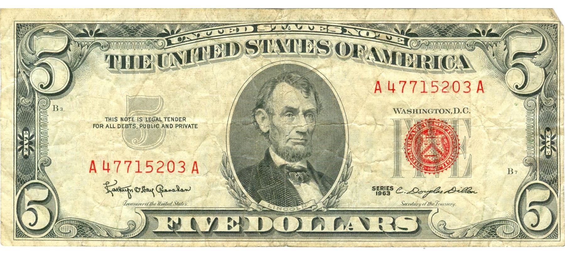 1963 $5 VG/XF Red Seal Note.