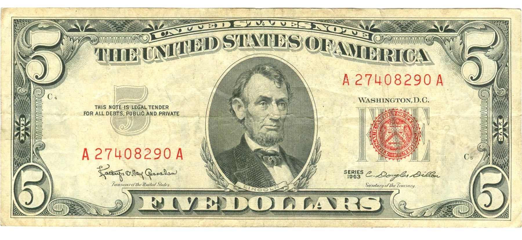 1963 $5 VG/XF Red Seal Note.