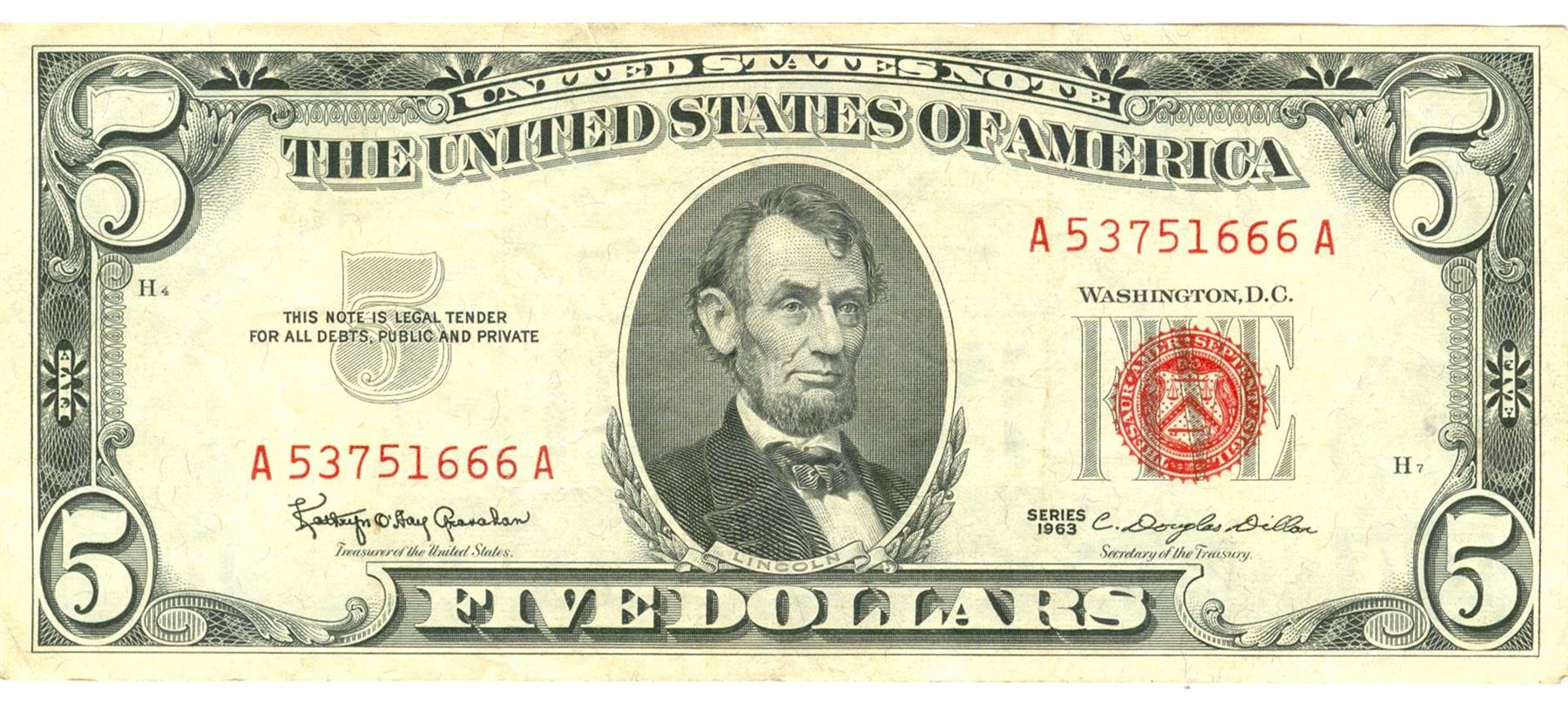 1963 $5 VG/XF Red Seal Note.