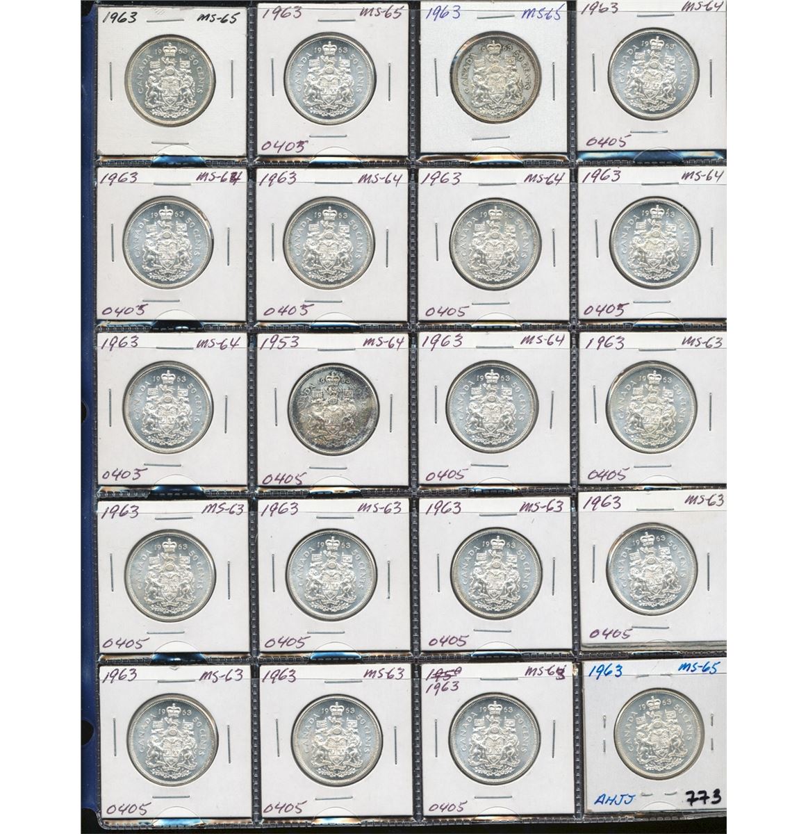 1963 50¢ BU Partial Roll Lot; includes 20 pieces all in 2x2's full white MS63 to MS65. A nice lot that should be inspected.