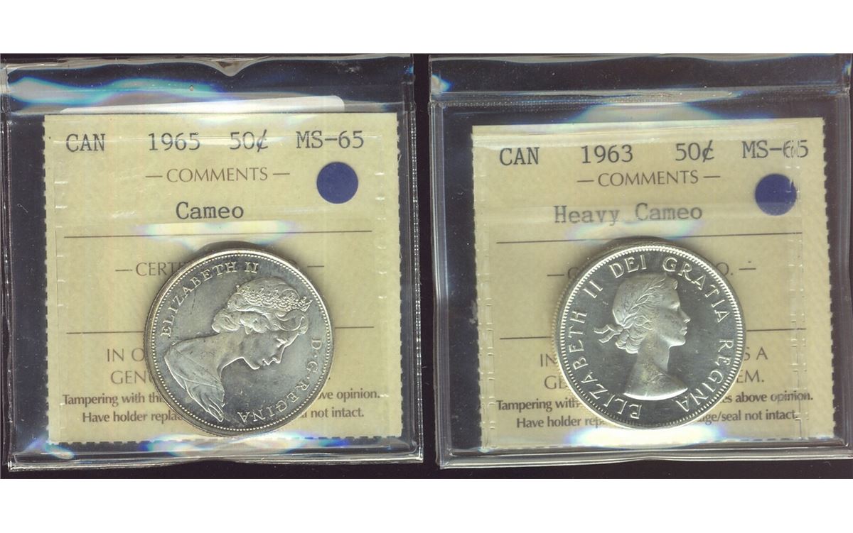 1963 50¢ Heavy Cameo & 1965 Cameo both ICCS MS65. Lot of 2 coins.