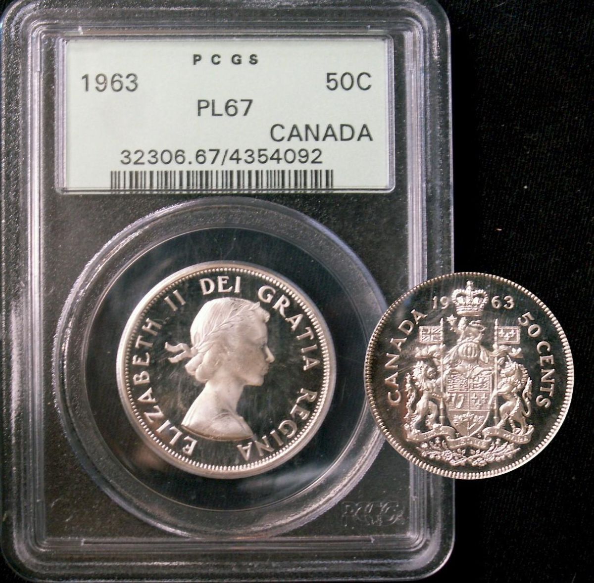 1963 50¢ PCGS PL67. Old green PCGS holder with Cameo to Heavy Cameo finish.