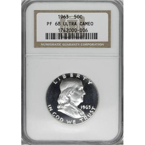 <B>1963 50C PR68 Deep Cameo NGC.</B></I> NGC Census: (155/5). PCGS Population (194/16). Numismedia Wsl. Price for NGC/PCGS coin in PR68: $380. (#96704)<BR><BR><b>Shipping:</b> Coins & Currency (<a target="_blank" href="http://www.heritageauctions.com/common/shipping.php">view shipping information</a>)