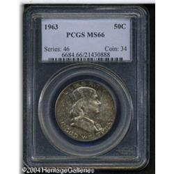 1963 50C MS66 PCGS. Well struck with amazingly bri <B>1963 50C MS66 PCGS.</B></I> Well struck with amazingly bright, flashy luster, and a thick layer of speckled olive, orange, and apricot-brown patina over both sides of the coin. A noticeable abrasion on the lower reverse, which bisects the L in HALF, is the only surface blemish on either side that is not more-or-less fully concealed by the rich toning. <BR><BR><B>Important notice:</B> Heritage usually auctions material at the rate of 200-250 lots per hour. On some occasions eBay Live bid software or the Internet may not be able to keep up with the pace of the auction. We recommend placing a realistic absentee bid now as insurance to avoid disappointment. Occasionally the auctioneer may eliminate or reject an eBay Live bid, and the auctioneer may also reopen a lot after the close of the eBay live bidding (usually because we missed an audience bid), and may reject your bid even if it shows you as the winning bidder. By bidding via eBay Live, you agree that Heritage may award the lot to another bidder at its sole discretion under the circumstances described above or any other reasonable circumstances. Since eBay bids are not shown to us until we open the lot on the floor, we treat those bids just like floor bids. In most cases the floor responds before the eBay bid is presented to us, due to Internet lag time, so for consistency we have made it a policy that floor bids are always considered first over tie eBay live bids. Also please note that all Heritage lots purchased through eBay Live carry a 20% Buyer's Premium. Please make sure you read the Terms and Conditions before you bid. This lot is being auctioned in conjunction with a live floor auction by Heritage Galleries & Auctioneers. All final auction and invoice information will be supplied by Heritage Galleries & Auctioneers, and all other information should be considered preliminary. Lot:6331