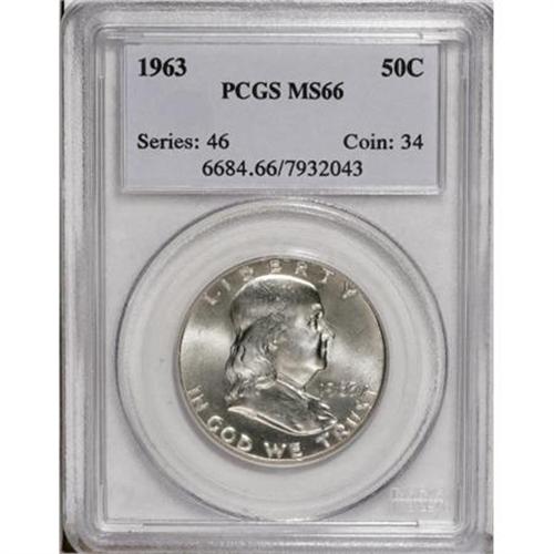 <B>1963 50C MS66 PCGS.</B></I> A strongly lustrous, well struck example of this surprisingly elusive final-year Franklin half issue. Minimally toned and pleasingly preserved, this piece is in a tie for the finest graded by PCGS (12/07).<BR><BR><B>Coin Engraver:</B> John R. Sinnock<BR><BR><b>Shipping:</b> Coins & Currency (<a target="_blank" href="http://www.heritageauctions.com/common/shipping.php">view shipping information</a>)