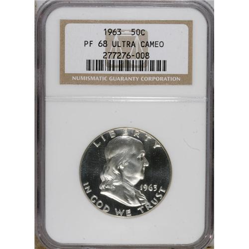 <B>1963 50C PR68 Deep Cameo NGC.</B></I> NGC Census: (304/10). PCGS Population (193/16). Numismedia Wsl. Price for NGC/PCGS coin in PR68: $380. (#96704)<BR><BR><b>Shipping:</b> Coins & Currency (<a target="_blank" href="http://www.heritageauctions.com/common/shipping.php">view shipping information</a>)
