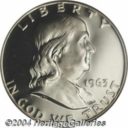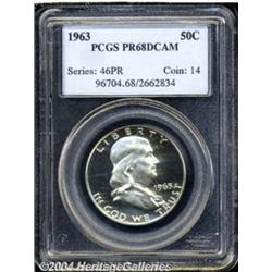 <B>1963<50C> PR68 Deep Cameo PCGS.</B></I> Fully struck and free of hairlines or contact marks, this Superb Gem proof exhibits deeply-mirrored, inky-black fields. The richly frosted devices are remarkably pristine, and free of die striations or toning spots. The deep cameo contrast is compelling, on both obverse and reverse.<BR><I>From the JFS Collection.</B></I> <BR><BR><B>Important notice:</B> Heritage usually auctions material at the rate of 200-250 lots per hour. On some occasions eBay Live bid software or the Internet may not be able to keep up with the pace of the auction. We recommend placing a realistic absentee bid now as insurance to avoid disappointment. Occasionally the auctioneer may eliminate or reject an eBay Live bid, and the auctioneer may also reopen a lot after the close of the eBay live bidding (usually because we missed an audience bid), and may reject your bid even if it shows you as the winning bidder. By bidding via eBay Live, you agree that Heritage may award the lot to another bidder at its sole discretion under the circumstances described above or any other reasonable circumstances. Since eBay bids are not shown to us until we open the lot on the floor, we treat those bids just like floor bids. In most cases the floor responds before the eBay bid is presented to us, due to Internet lag time, so for consistency we have made it a policy that floor bids are always considered first over tie eBay live bids. Also please note that all Heritage lots purchased through eBay Live carry a 20% Buyer's Premium. Please make sure you read the Terms and Conditions before you bid. </span></font></tr></table></td></tr></table>