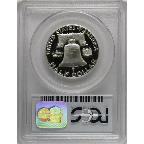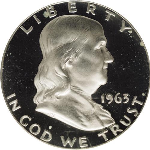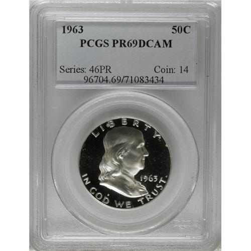 <B>1963 50C PR69 Deep Cameo PCGS.</B></I> As close to perfect as one can find for this series, this proof has bold contrast between the deep mirrors and the richly frosted devices. A small spot of milky toning is noted above the D in GOD, and a few specks of tan are present on the bell, but this piece is otherwise untoned. Population: 16 in 69 Deep Cameo, 0 finer (11/06).<BR><BR><b>Shipping:</b> Coin/Currency (<a target="_blank" href="http://www.heritageauctions.com/common/shipping.php">view shipping information</a>)