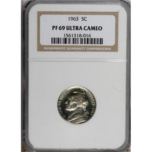 <B>1963 5C PR69 Deep Cameo NGC.</B></I> NGC Census: (38/0). PCGS Population (64/1). Numismedia Wsl. Price for NGC/PCGS coin in PR69: $180. (#94195)<BR><BR><b>Shipping:</b> Coins & Currency (<a target="_blank" href="http://www.heritageauctions.com/common/shipping.php">view shipping information</a>\)