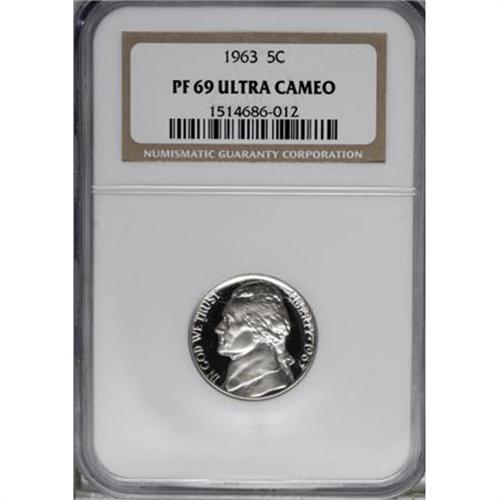 <B>1963 5C PR69 Deep Cameo NGC.</B></I> NGC Census: (38/0). PCGS Population (70/1). Numismedia Wsl. Price for NGC/PCGS coin in PR69: $185. (#94195)<BR><BR><b>Shipping:</b> Coins & Currency (<a target="_blank" href="http://www.heritageauctions.com/common/shipping.php">view shipping information</a>)