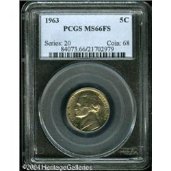 1963 5C MS66 Full Steps PCGS. A mix of pale blue, <B>1963 5C MS66 Full Steps PCGS.</B></I> A mix of pale blue, light rose, and olive-gold coloration bathes lustrous surfaces. The design features are well impressed, and a few minute marks are seen on Jefferson's face, neck, and collar. Population: 11 in 66, 0 finer (10/04). <BR><BR><B>Important notice:</B> Heritage usually auctions material at the rate of 200-250 lots per hour. On some occasions eBay Live bid software or the Internet may not be able to keep up with the pace of the auction. We recommend placing a realistic absentee bid now as insurance to avoid disappointment. Occasionally the auctioneer may eliminate or reject an eBay Live bid, and the auctioneer may also reopen a lot after the close of the eBay live bidding (usually because we missed an audience bid), and may reject your bid even if it shows you as the winning bidder. By bidding via eBay Live, you agree that Heritage may award the lot to another bidder at its sole discretion under the circumstances described above or any other reasonable circumstances. Since eBay bids are not shown to us until we open the lot on the floor, we treat those bids just like floor bids. In most cases the floor responds before the eBay bid is presented to us, due to Internet lag time, so for consistency we have made it a policy that floor bids are always considered first over tie eBay live bids. Also please note that all Heritage lots purchased through eBay Live carry a 20% Buyer's Premium. Please make sure you read the Terms and Conditions before you bid. This lot is being auctioned in conjunction with a live floor auction by Heritage Galleries & Auctioneers. All final auction and invoice information will be supplied by Heritage Galleries & Auctioneers, and all other information should be considered preliminary. Lot:5647