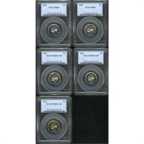 <B>(2)1963 5C PR 65 PCGS, (3)1963 5C PR 65 Cameo PCGS.</B></I><BR><BR><B>Coin Engraver:</B> Felix Schlag<BR><BR><b>Shipping:</b> Coins & Currency (<a target="_blank" href="http://www.heritageauctions.com/common/shipping.php">view shipping information</a>)