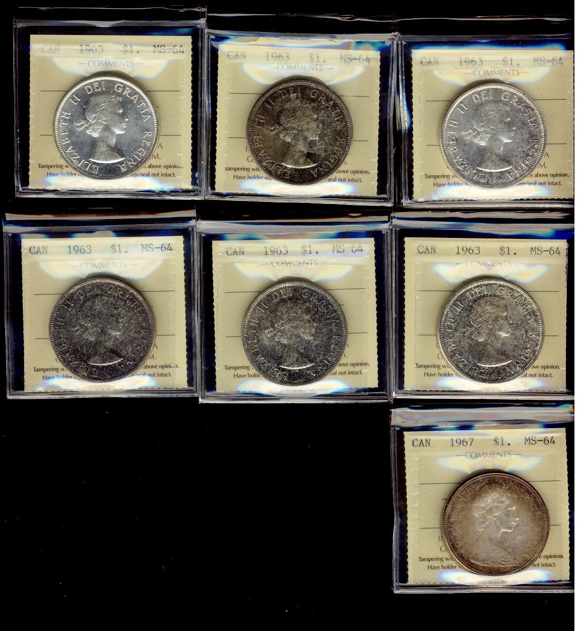 1963(6) & 1967 $1 ICCS MS64. Lot of 7 coins.