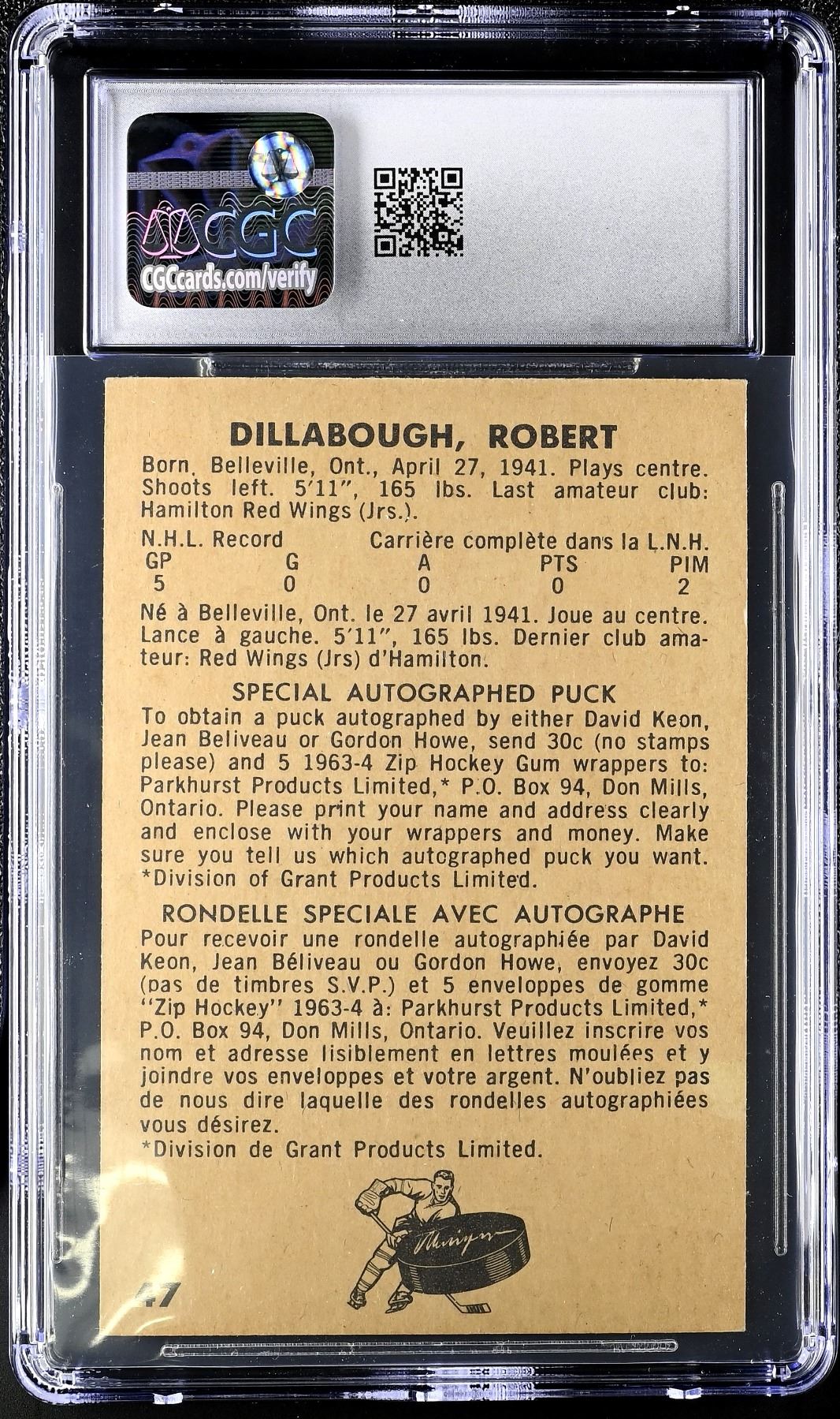 Dillabough played from 1961 to 1974, including stops in the NHL, AHL, EPHL, WHL, IHL and WHA. This is his rookie card, graded 5.5 EX+ by CGC.