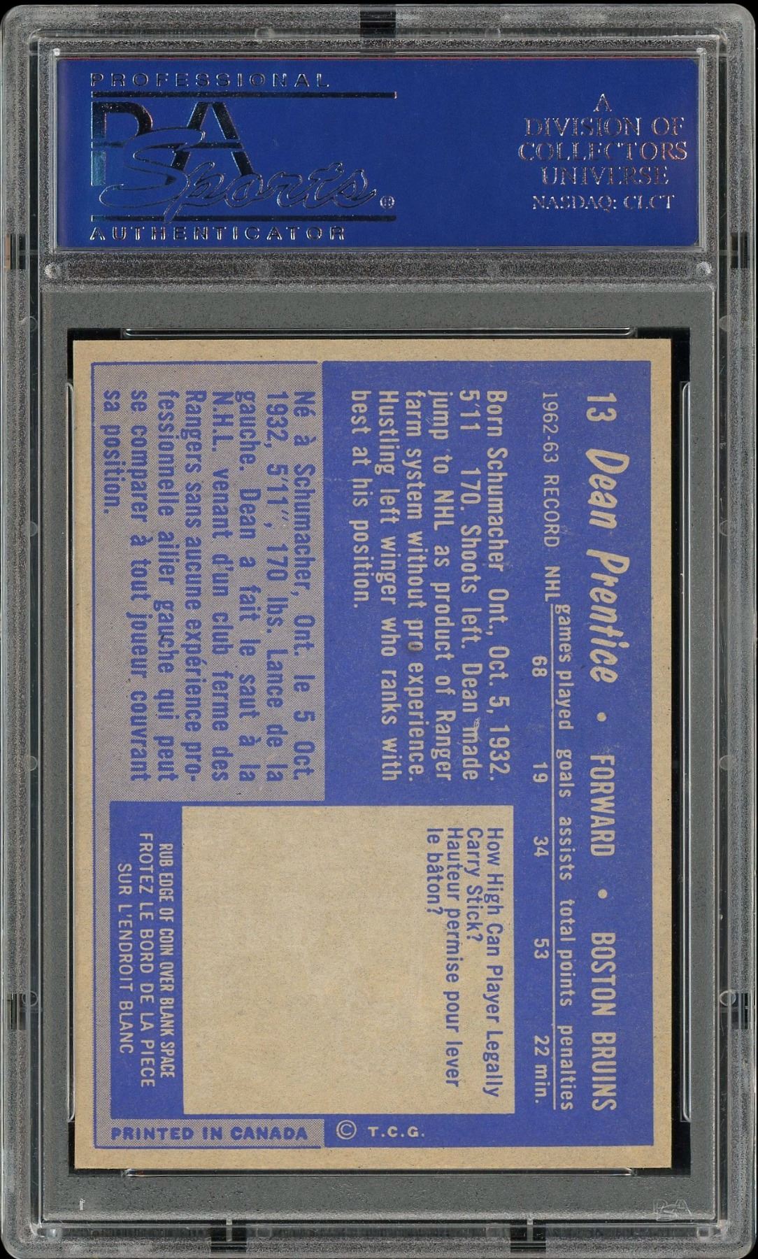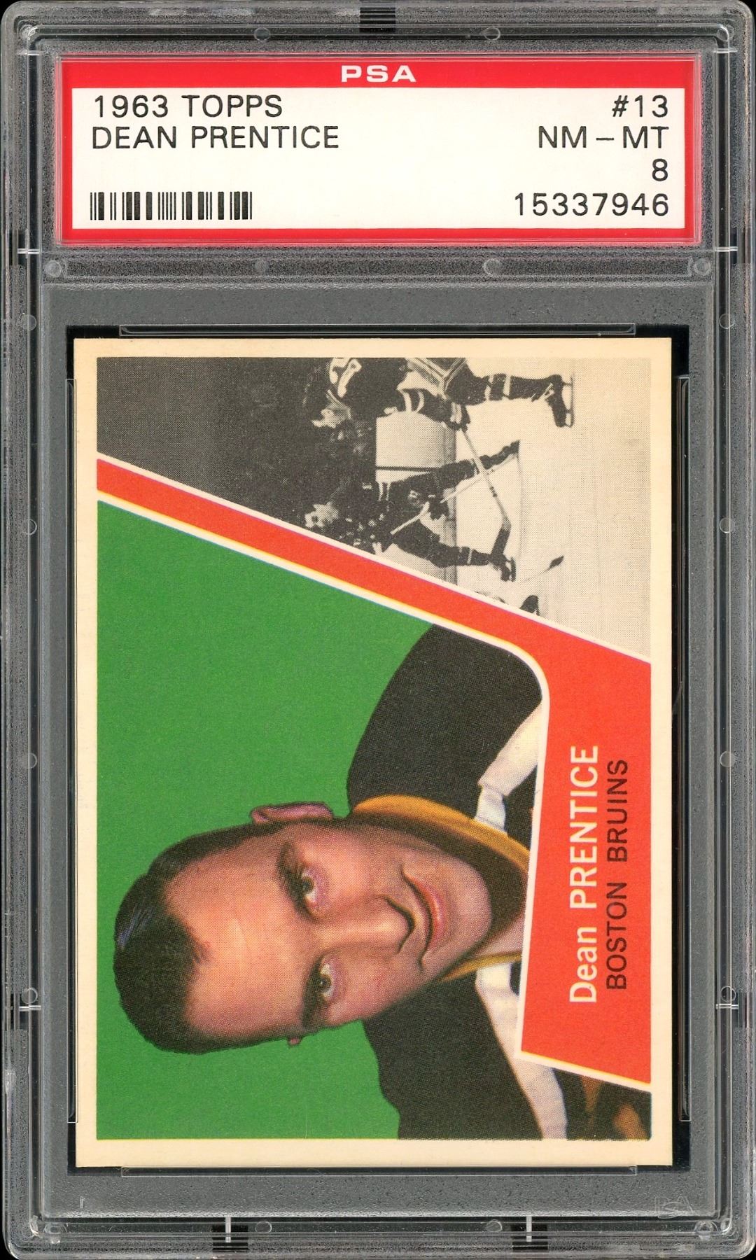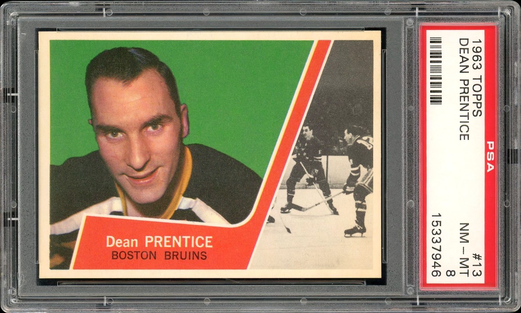 Nice high-grade example of this long time NHLer's 63 Topps offering. Prentice lasted an incredible 22 seasons. He scored 391 goals and 860 points, played in several all-star games and was a 2nd team All-Star in 1960. Graded 8 NM-MT by PSA!