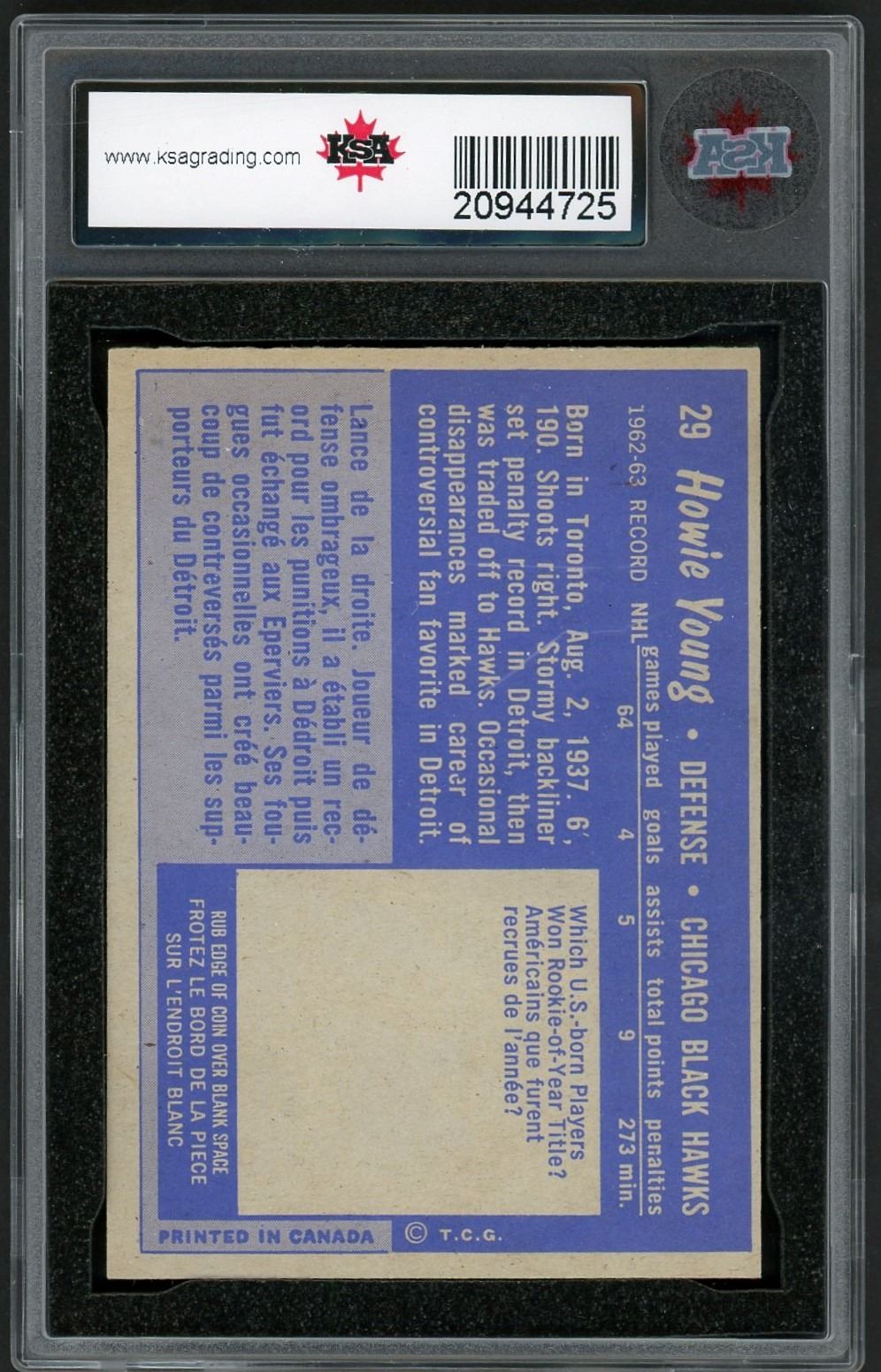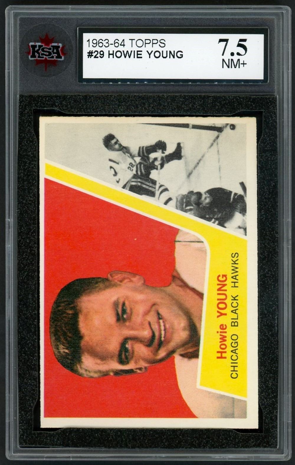 Rookie card of the wild man, "Cowboy" Howie Young, who spent a lot of time in the penalty box before becoming a Hollywood actor and stuntman. In 685 professional hockey games in four leagues (WHL, AHL, NHL, WHA), he racked up 2,495 minutes in the sin bin. This one grades 7.5 NM+ by KSA!