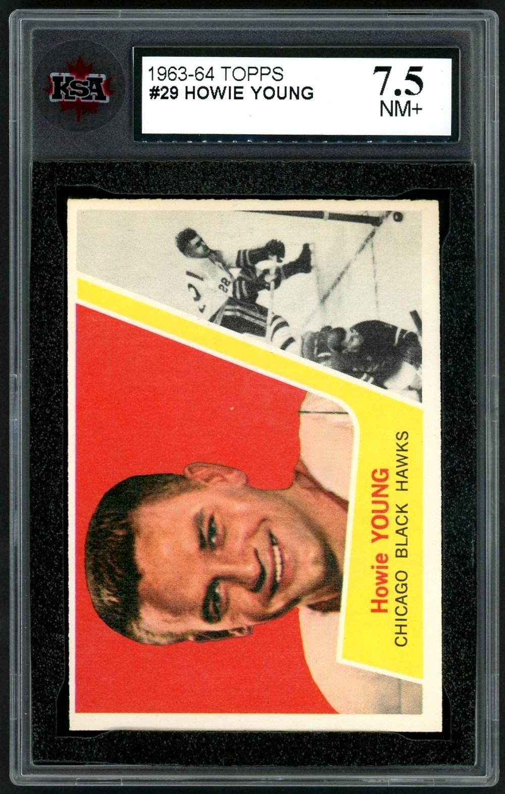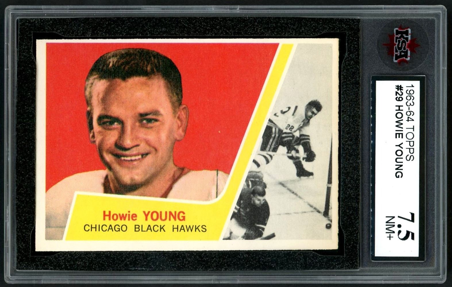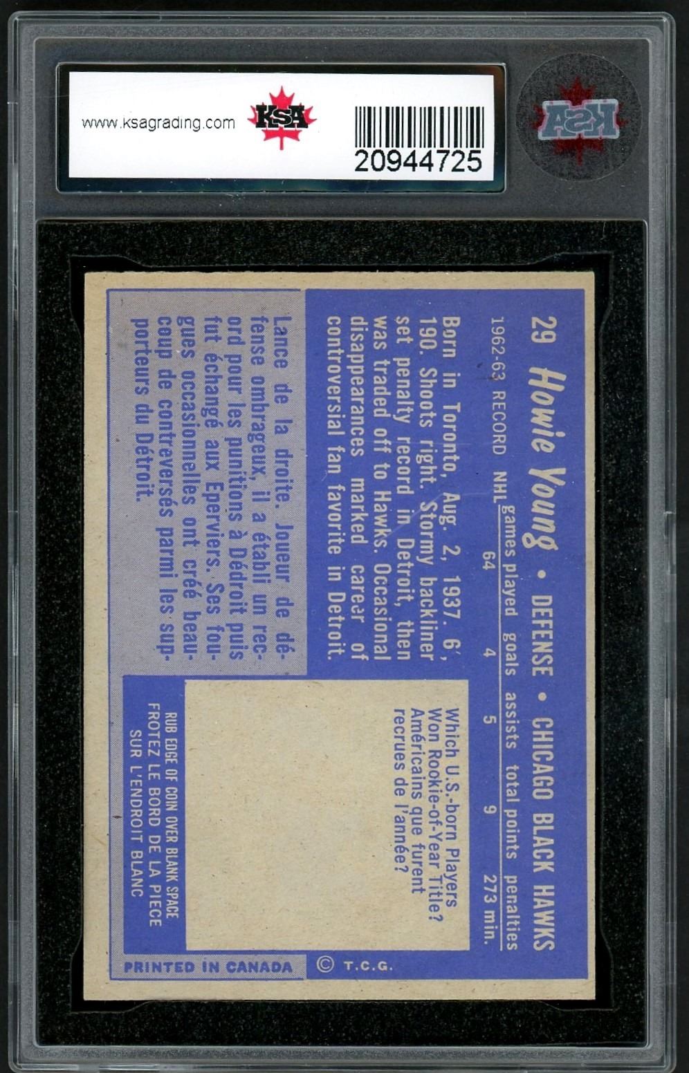 Rookie card of Howie Young, a notorious scrapper who in 1963 broke Lou Fontinato's single season penalty minute record (202) when he recorded 273 minutes in the sin bin. His aggressiveness landed him on the cover of Sports Illustrated. Unfortunately he was a full blown alcoholic during the first half if his career. His game and off-ice exploits began to take their toll and he bounced around from team to team and league to league. After sobering up he finished his playing career with a few years in the WHA. After hockey he spent a few years in Hollywood acting in films and doing stunt work. Graded 7.5 NM+ by KSA.