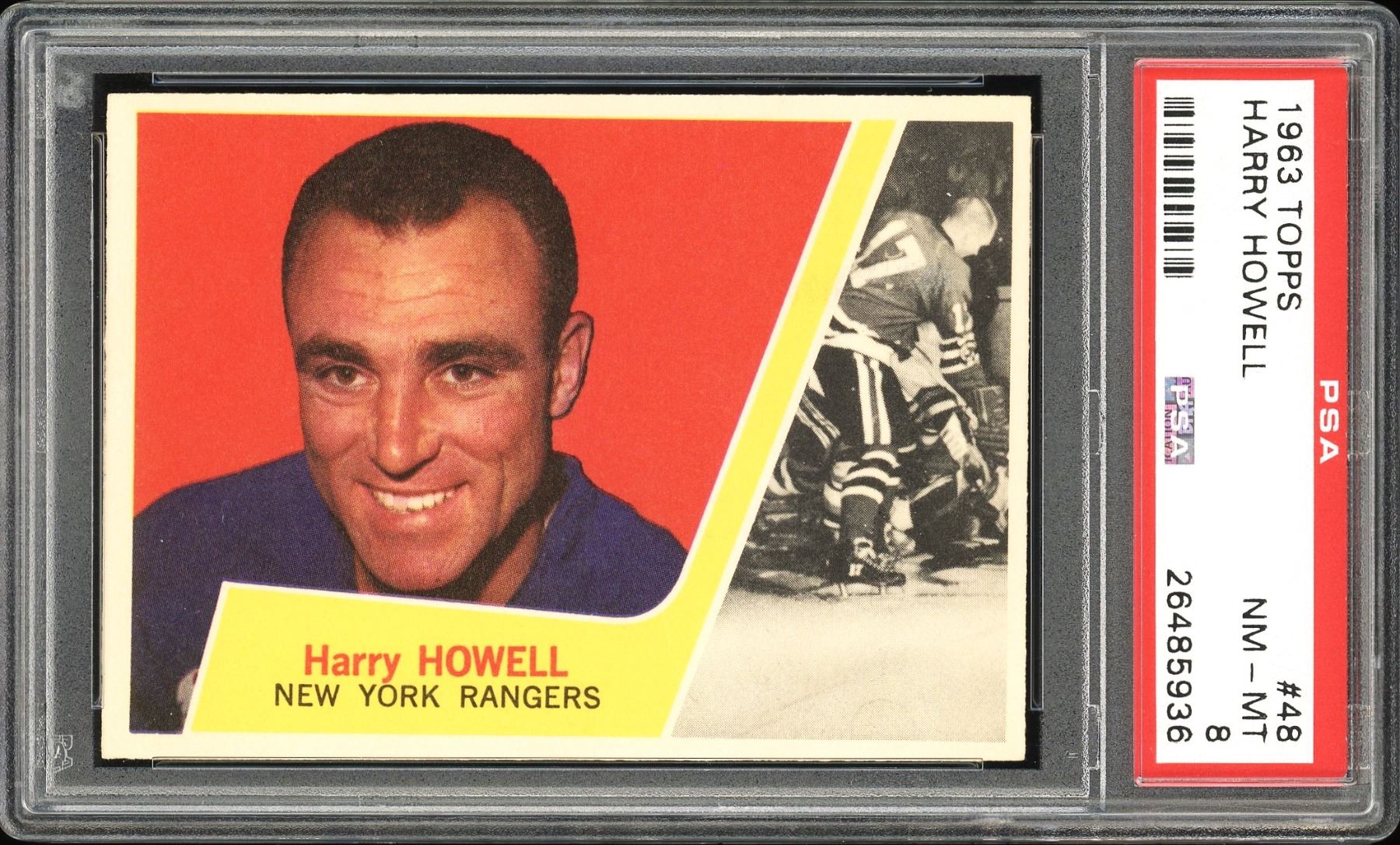Super high-grade card of Norris Trophy winning HOFer, Harry Howell, who played pro for 24 seasons, including 21 in the NHL where he was known as a tough and dependable defenseman. Graded a sharp 8 NM-MT by PSA!