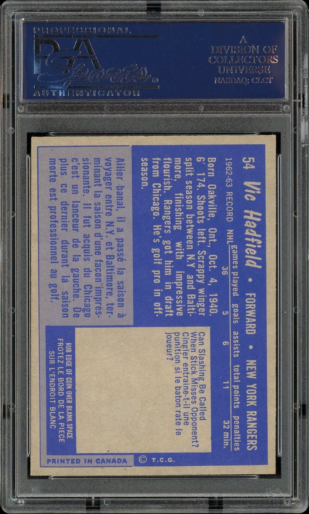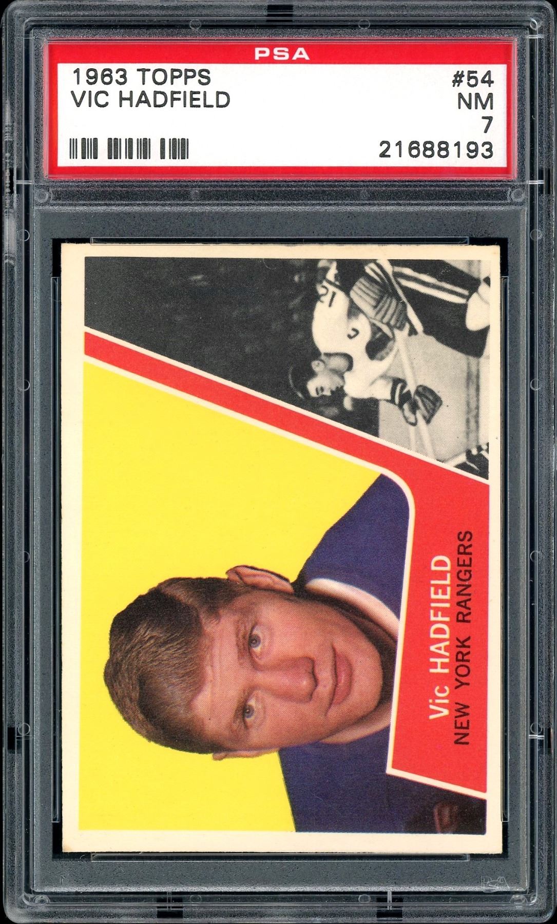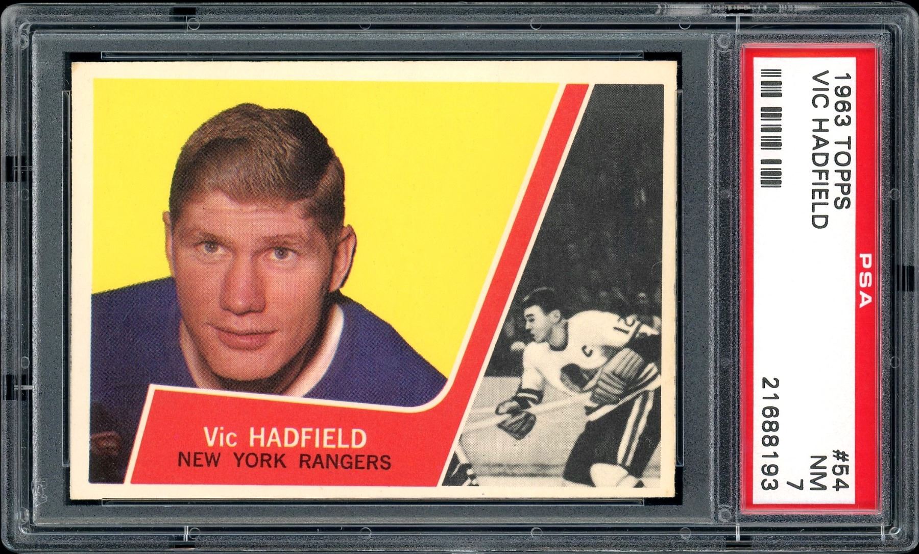 Hadfield was a power forward before the term was in use. He combined scoring (13 times 10+ goals, including nine consecutive seasons of 20 or more goals), with a robust style (he led the NHL in penalty minutes with 151 in 1964). In 1972 he scored 50 goals and 106 points while racking up 142 minutes in penalties. Graded a nice 7 NM by PSA!