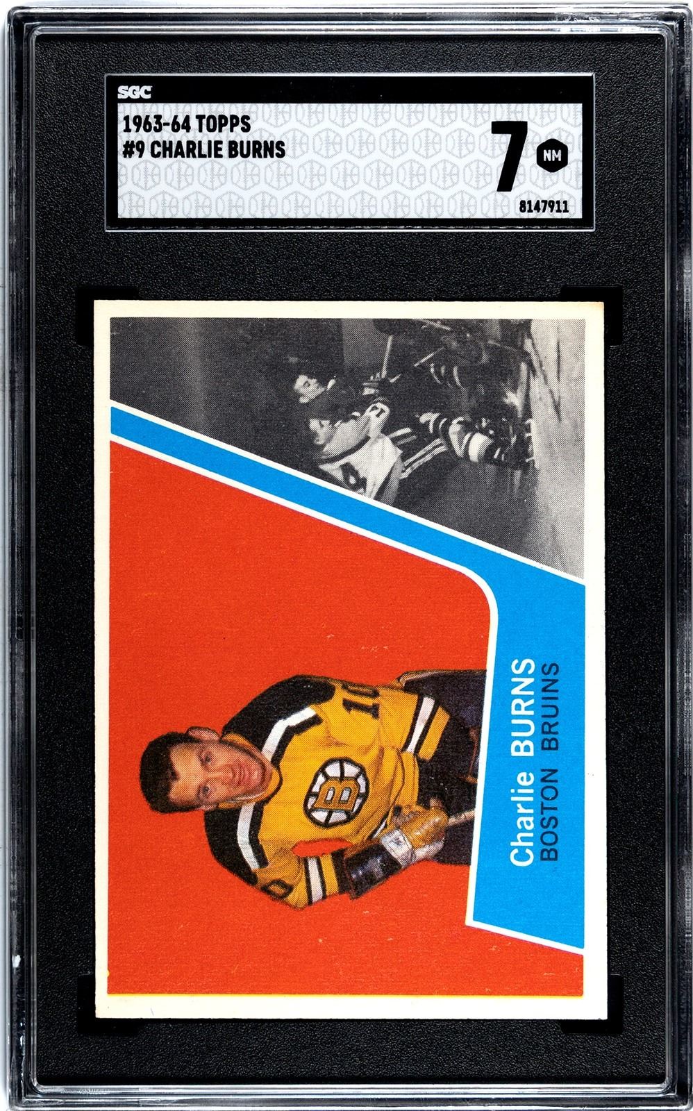 Burns, one of the first full-time helmet wearing NHLers, played 749 NHL games and several hundred more in the minors. He was a well-known shorthanded specialist, leading the NHL in SHG in 1961. Graded 7 NM by SGC!