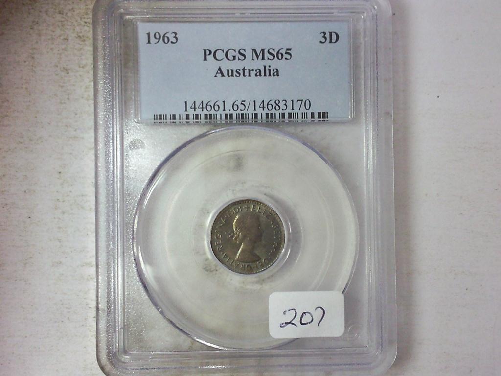 1963 (AUSTRALIA) 3 PENCE PCGS MS65