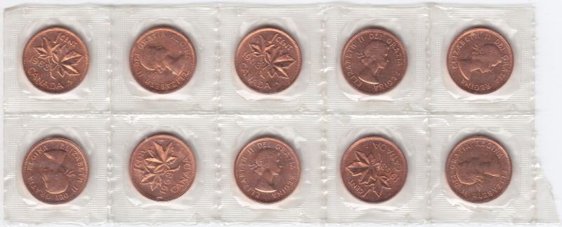 10 1963 Canadian Small 1-Cent Penny Coins In Original Plyo-Film Sheet - Book Value $50