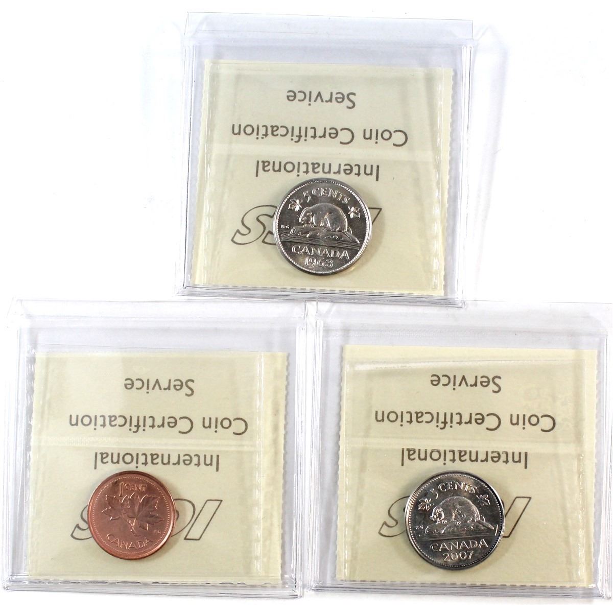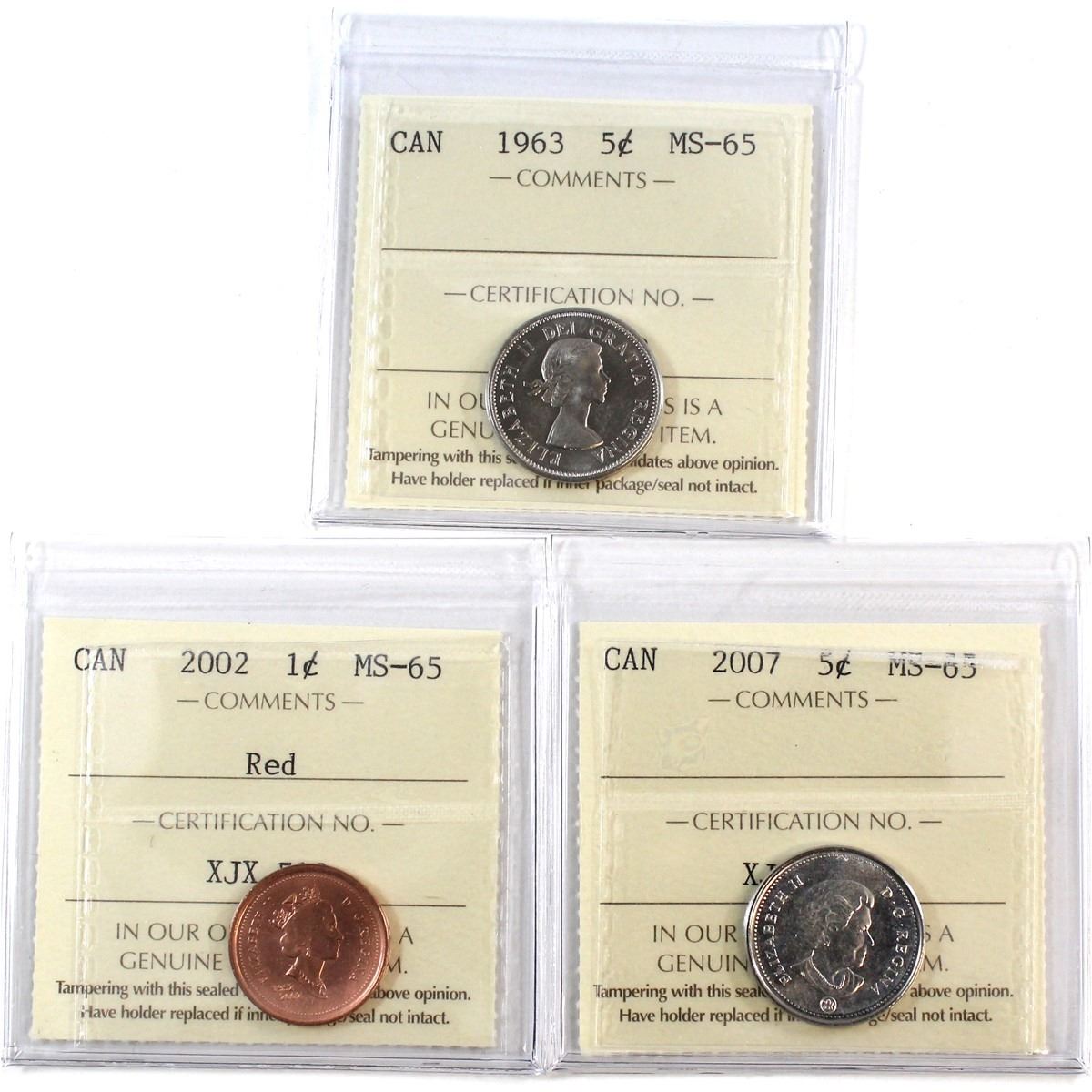 1963 Canada 5-cent, 2002 Canada 1-cent Red, 2007 Canada 5-cent ICCS Certified MS-65. 3pcs.