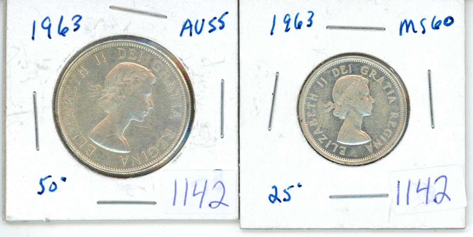 1963 Canadian 50 cent & 25 cent coins - AU55 & MS60