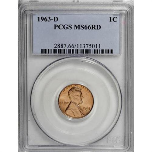 <B>1963-D 1C MS66 Red PCGS.</B></I> PCGS Population (40/0). NGC Census: (113/2). Mintage: 1,774,020,352. Numismedia Wsl. Price for NGC/PCGS coin in MS66: $100. (#2887)<BR><BR><B>Coin Engraver:</B> Victor D. Brenner<BR><BR><b>Shipping:</b> Coins & Currency (<a target="_blank" href="http://www.heritageauctions.com/common/shipping.php">view shipping information</a>\)