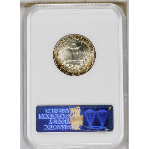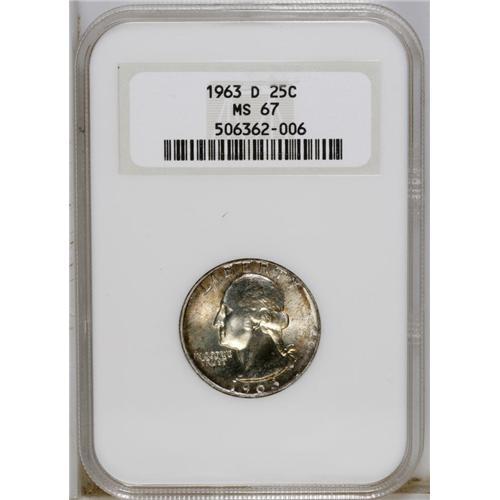 <B>1963-D 25C MS67 NGC.</B></I> Dappled russet and blue patina appears in the fields, while a small central area of each side is untoned. Highly lustrous with an above-average strike. Tied for the finest certified by either NGC or PCGS (12/06).<BR><BR><b>Shipping:</b> Coin/Currency (<a target="_blank" href="http://www.heritageauctions.com/common/shipping.php">view shipping information</a>)