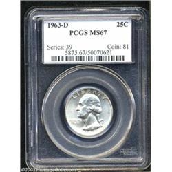 <table><tr><td><TABLE cellSpacing=0 cellPadding=0 width="100%" bgColor=#000000 border=0><TBODY> <TR><TD width="100%"><TABLE cellSpacing=1 cellPadding=3 width="100%" border=0><TBODY><TR><TD width="100%" bgColor=#79735c><FONT face=arial color=#ffffff size=3><B>Description</B> </FONT></TD></TR><TR><TD width="100%" bgColor=#ffffff><FONT face=arial size=2><B>1963-D 25C MS67 PCGS.</B></I> Frosty and as fresh as if it just came from an original roll. There are no mentionable abrasions visible on either side of this Superb Gem. </FONT></TD></TR></TBODY></TABLE></TD></TR></TBODY></TABLE><BR><A name=PricesRealized></A><TABLE cellSpacing=0 cellPadding=0 width="100%" bgColor=#000000 border=0><TBODY><TR><TD width="100%"><TABLE cellSpacing=1 cellPadding=3 width="100%" border=0><TBODY><TR><TD width="100%" bgColor=#79735c><A name=PR><FONT face=arial color=#ffffff size=3><B>Previous Prices from Heritage Auctions</B> </FONT></A></TD></TR><TR><TD bgColor=#f6f6ed><TABLE cellSpacing=0 cellPadding=0 width="100%" border=1><TBODY><TR><TD align=middle width="33%"><B>Date</B></TD><TD align=middle width="33%"><B>Service</B></TD><TD align=middle width="33%"><B>Price</B></TD></TR><TR bgColor=whitesmoke><TD width="33%"><B>03/01/2003</B></TD><TD width="33%">NGC</TD><TD width="33%">$1,552.50</TD></TR></TBODY></TABLE></TD></TR><TR><TD bgColor=#ffffff><FONT face=arial size=1 ?>PLEASE NOTE: All prices realized reflect the final hammer price PLUS the buyer's premium in auctions that charge a buyer's premium. Each item has a notation at the top of the listing indicating whether that lot included a buyer's premium. Example: A item that sells with a final hammer price of $100 and a 20% buyer's premium will display with a price realized of $120. All information listed is intended to be as accurate as possible, but errors are possible. Please use this guide carefully and inform us of any inaccuracies. </FONT></TD></TR></TBODY></TABLE></TD></TR></TBODY></TABLE><BR><TABLE cellSpacing=0 cellPadding=0 width="100%" bgColor=#000000 border=0><TBODY><TR><TD width="100%"><TABLE cellSpacing=1 cellPadding=3 width="100%" border=0><TBODY><TR><TD width="100%" bgColor=#79735c colSpan=6><FONT face=arial color=#ffffff size=3><B>Price Guide*</B> </FONT></TD></TR><TR bgColor=#f6f6ed><TD align=middle><B>Grade</B> </TD><TD align=middle><B>Coin World<BR>(Trends)</B> </TD><TD align=middle><B>Numismedia<BR>Retail</B> </TD><TD align=middle><B>Numismedia<BR>Wholesale</B> </TD><TD align=middle><B>Coin<BR>Universe</B> </TD><TD align=middle><B>Heritage<BR>Value Index</B> </TD></TR><TR bgColor=#ffffff><TD align=middle>66</TD><TD align=right>---</TD><TD align=right>$81.00</TD><TD align=right>$65.00</TD><TD align=right>$70.00</TD><TD align=right>$50.00</TD></TR><TR style="FONT-WEIGHT: bold" bgColor=#cccfdd><TD align=middle>67</TD><TD align=right>---</TD><TD align=right>---</TD><TD align=right>---</TD><TD align=right>---</TD><TD align=right>---</TD></TR><TR bgColor=#ffffff><TD align=middle>68</TD><TD align=right>---</TD><TD align=right>---</TD><TD align=right>---</TD><TD align=right>---</TD><TD align=right>---</TD></TR><TR bgColor=#ffffff><TD colSpan=6><FONT size=1>*All information listed is intended to be as accurate as possible, but errors are possible. No item may be returned or refused based on this information which is provided as a service to our customers. You should contact each pricing source directly to determine the accuracy of this information. </FONT></TD></TR></TBODY></TABLE></TD></TR></TBODY></TABLE><BR><TABLE cellSpacing=0 cellPadding=0 width="100%" bgColor=#000000 border=0><TBODY><TR><TD width="100%"><TABLE cellSpacing=1 cellPadding=3 width="100%" border=0><TBODY><TR><TD width="100%" bgColor=#79735c><FONT face=arial color=#ffffff size=3><B>Population Guide</B> </FONT></TD></TR><TR bgColor=#ffffff><TD align=middle><!-- Begin Output of Population Grid--><TABLE cellSpacing=0 cellPadding=0 width="100%" border=0><TBODY><TR><TD vAlign=center><TABLE cellSpacing=0 width="100%" border=1 cellsadding="3"><TBODY><TR><TD vAlign=center><TABLE cellSpacing=0 cellPadding=3 width="100%" border=1><TBODY><TR><TD vAlign=center align=middle bgColor=#f0f1e8 colSpan=2 <CENTER><FONT face=Arial size=2><B>PCGS Pop </B></FONT><CENTER></CENTER></TD><TD vAlign=center align=middle bgColor=#f0f1e8 colSpan=2><CENTER><FONT face=Arial size=2><B>NGC Pop</B></CENTER></FONT></TD></TR><TR><TD vAlign=center><FONT face=Arial size=2>(67)</FONT> </TD><TD vAlign=center align=right><FONT face=Arial size=2>3</FONT> </TD><TD vAlign=center><FONT face=Arial size=2>(67)</FONT> </TD><TD vAlign=center align=right><FONT face=Arial size=2>28</FONT> </TD></TR><TR><TD vAlign=center><FONT face=Arial size=2>(>67)</FONT> </TD><TD vAlign=center align=right><FONT face=Arial size=2>0</FONT> </TD><TD vAlign=center><FONT face=Arial size=2>(>67)</FONT> </TD><TD vAlign=center align=right><FONT face=Arial size=2>0</FONT> </TD></TR></TBODY></TABLE></TD></TR></TBODY></TABLE></TD></TR></TBODY></TABLE><!-- End Output of Population Grid--></TD></TR></TBODY></TABLE></TD></TR></TBODY></TABLE><BR><TABLE cellSpacing=0 cellPadding=0 width="100%" bgColor=#000000 border=0><TBODY><TR> Important notice: Heritage usually auctions material at the rate of 200-250 lots per hour. On some occasions eBay Live bid software or the Internet may not be able to keep up with the pace of the auction. We recommend placing a realistic absentee bid now as insurance to avoid disappointment. Occasionally the auctioneer may eliminate or reject an eBay Live bid, and the auctioneer may also reopen a lot after the close of the eBay live bidding (usually because we missed an audience bid), and may reject your bid even if it shows you as the winning bidder. By bidding via eBay Live, you agree that Heritage may award the lot to another bidder at its sole discretion under the circumstances described above or any other reasonable circumstances. Also please note that all Heritage lots purchased through eBay Live carry a 20% Buyer's Premium. Please mak
