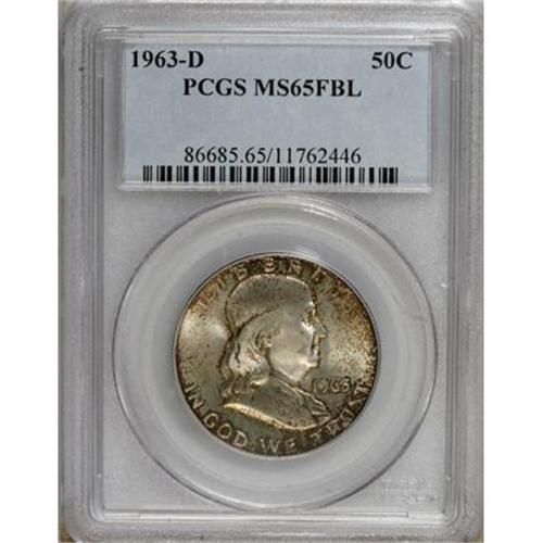 <B>1963-D 50C MS65 Full Bell Lines PCGS.</B></I> PCGS Population (706/59). NGC Census: (252/16). Numismedia Wsl. Price for NGC/PCGS coin in MS65: $110. (#86685)<BR><BR><b>Shipping:</b> Coins & Currency (<a target="_blank" href="http://www.heritageauctions.com/common/shipping.php">view shipping information</a>)
