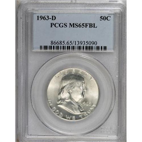 <B>1963-D 50C MS65 Full Bell Lines PCGS.</B></I> PCGS Population (711/59). NGC Census: (253/16). Numismedia Wsl. Price for NGC/PCGS coin in MS65: $110. (#86685)<BR><BR><b>Shipping:</b> Coins & Currency (<a target="_blank" href="http://www.heritageauctions.com/common/shipping.php">view shipping information</a>)