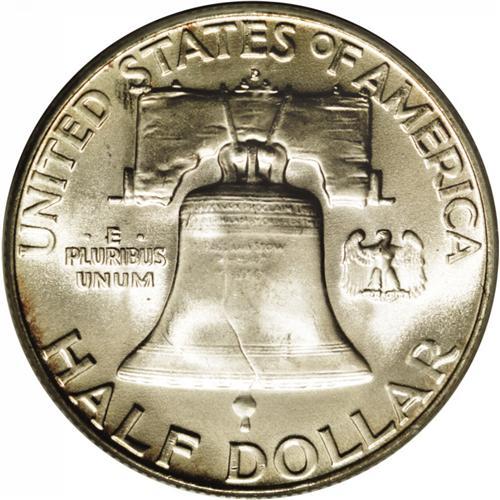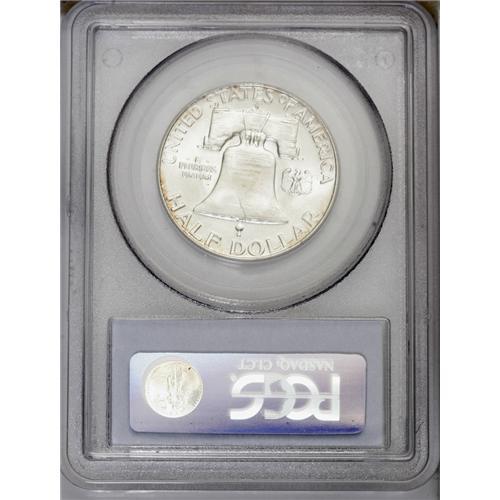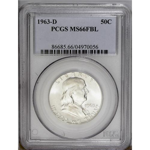 <B>1963-D<50C> MS66 Full Bell Lines PCGS.</B></I> A rarity in the Franklin half series in Full Bell Lines, the 1963-D is the series' number one problem child. Examples usually are found with a variety of impediments and surface distractions. Not so the present piece, with essentially pristine, well struck surfaces, largely brilliant save for a slight rim of amber toning on the reverse. The luster is satiny and near-unbroken. Only the faintest abrasions are seen under a loupe, save for a nick near the lower bell edge that requires mention. Population: 56 in 66 Full Bell Lines, 0 finer (3/06). <BR><BR><B>Important notice:</B> Heritage usually auctions material at the rate of 200-250 lots per hour. On some occasions eBay Live bid software or the Internet may not be able to keep up with the pace of the auction. We recommend placing a realistic absentee bid now as insurance to avoid disappointment. Occasionally the auctioneer may eliminate or reject an eBay Live bid, and the auctioneer may also reopen a lot after the close of the eBay live bidding (usually because we missed an audience bid), and may reject your bid even if it shows you as the winning bidder. By bidding via eBay Live, you agree that Heritage may award the lot to another bidder at its sole discretion under the circumstances described above or any other reasonable circumstances. Since eBay bids are not shown to us until we open the lot on the floor, we treat those bids just like floor bids. In most cases the floor responds before the eBay bid is presented to us, due to Internet lag time, so for consistency we have made it a policy that floor bids are always considered first over tie eBay live bids. Also please note that all Heritage lots purchased through eBay Live carry a 20% Buyer's Premium. Please make sure you read the Terms and Conditions before you bid. This lot is being auctioned in conjunction with a live floor auction by Heritage Galleries & Auctioneers. All final auction and invoice information will be supplied by Heritage Galleries & Auctioneers, and all other information should be considered preliminary. Lot:3140 <BR><BR><B>Winning Notification and Billing:</B> After the FINAL session in this auction is complete, Heritage will send e-mail and snail mail invoices. This process normally takes several days. All final auction and invoice information will be supplied by Heritage Galleries & Auctioneers, and all other information should be considered preliminary. <BR><BR>This auction will be conducted on a live auction floor and over the Internet through eBay Live. If you choose to place an absentee bid, please take a moment to <font color='#0000ff'><u><a href='http://pages.ebay.com/liveauctions/help/before/laabsentee.html'>learn how eBay Live absentee bidding works</a></u></font><font color='#000000'>