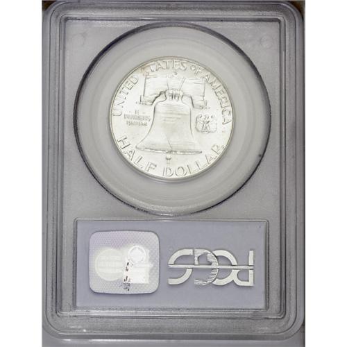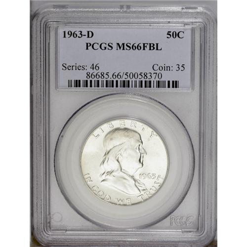 <B>1963-D<50C> MS66 Full Bell Lines PCGS.</B></I> Another problematic issue in the Franklin half series, the 1963-D consistently brings high prices when Premium Gem, Full Bell Lines coins such as the present example are offered. The issue seems to increase in popularity every year, and choice examples are likely to exit the market for long periods of time. This brilliant, untoned example has robustly struck details. Two dotlike ticks on the chin of Franklin are noted under a glass. Population: 56 in 66, 0 finer (3/06). <BR><BR><B>Important notice:</B> Heritage usually auctions material at the rate of 200-250 lots per hour. On some occasions eBay Live bid software or the Internet may not be able to keep up with the pace of the auction. We recommend placing a realistic absentee bid now as insurance to avoid disappointment. Occasionally the auctioneer may eliminate or reject an eBay Live bid, and the auctioneer may also reopen a lot after the close of the eBay live bidding (usually because we missed an audience bid), and may reject your bid even if it shows you as the winning bidder. By bidding via eBay Live, you agree that Heritage may award the lot to another bidder at its sole discretion under the circumstances described above or any other reasonable circumstances. Since eBay bids are not shown to us until we open the lot on the floor, we treat those bids just like floor bids. In most cases the floor responds before the eBay bid is presented to us, due to Internet lag time, so for consistency we have made it a policy that floor bids are always considered first over tie eBay live bids. Also please note that all Heritage lots purchased through eBay Live carry a 20% Buyer's Premium. Please make sure you read the Terms and Conditions before you bid. This lot is being auctioned in conjunction with a live floor auction by Heritage Galleries & Auctioneers. All final auction and invoice information will be supplied by Heritage Galleries & Auctioneers, and all other information should be considered preliminary. Lot:3139 <BR><BR><B>Winning Notification and Billing:</B> After the FINAL session in this auction is complete, Heritage will send e-mail and snail mail invoices. This process normally takes several days. All final auction and invoice information will be supplied by Heritage Galleries & Auctioneers, and all other information should be considered preliminary. <BR><BR>This auction will be conducted on a live auction floor and over the Internet through eBay Live. If you choose to place an absentee bid, please take a moment to <font color='#0000ff'><u><a href='http://pages.ebay.com/liveauctions/help/before/laabsentee.html'>learn how eBay Live absentee bidding works</a></u></font><font color='#000000'>