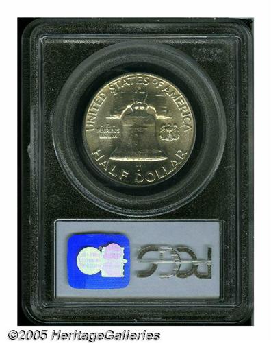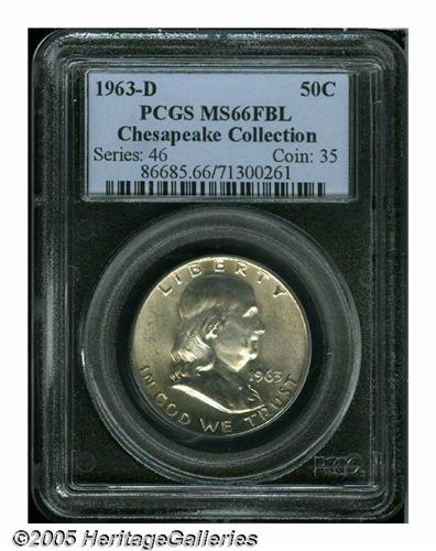 <B>1963-D<50C> MS66 Full Bell Lines PCGS.</B></I> Ex: Chesapeake Collection. Although an inordinate number of 1963-D Half Dollars were struck (over 67 million pieces), these were carelessly stored as bullion, and many were condemned to the smelter when silver crested circa 1980. This lustrous and impressively preserved Gem not only avoided such an ignominious fate, but both sets of bell lines have bold definition. Lightly toned and with only trivial softness of definition on the peripheral legends. Population: 50 in 66, 0 finer (4/05).