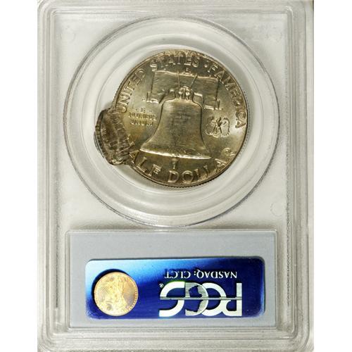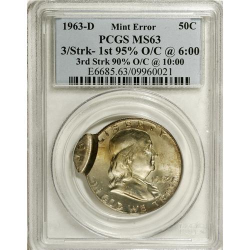 <B>1963-D 50C Franklin Half--Triple Struck--MS63 PCGS.</B></I> First struck far off-center, visible as a small 95% off-center design fragment near 6 o'clock on the obverse. The second strike was centered, but the third created a 90% off-center area that projects from 10 o'clock. Lustrous with rose toning in the fields. Errors on Franklin halves are very scarce, and this cataloger has never even heard of a triple struck Franklin prior to seeing the present specimen.<BR><BR><b>Shipping:</b> Coin/Currency (<a target="_blank" href="http://www.heritageauctions.com/common/shipping.php">view shipping information</a>)