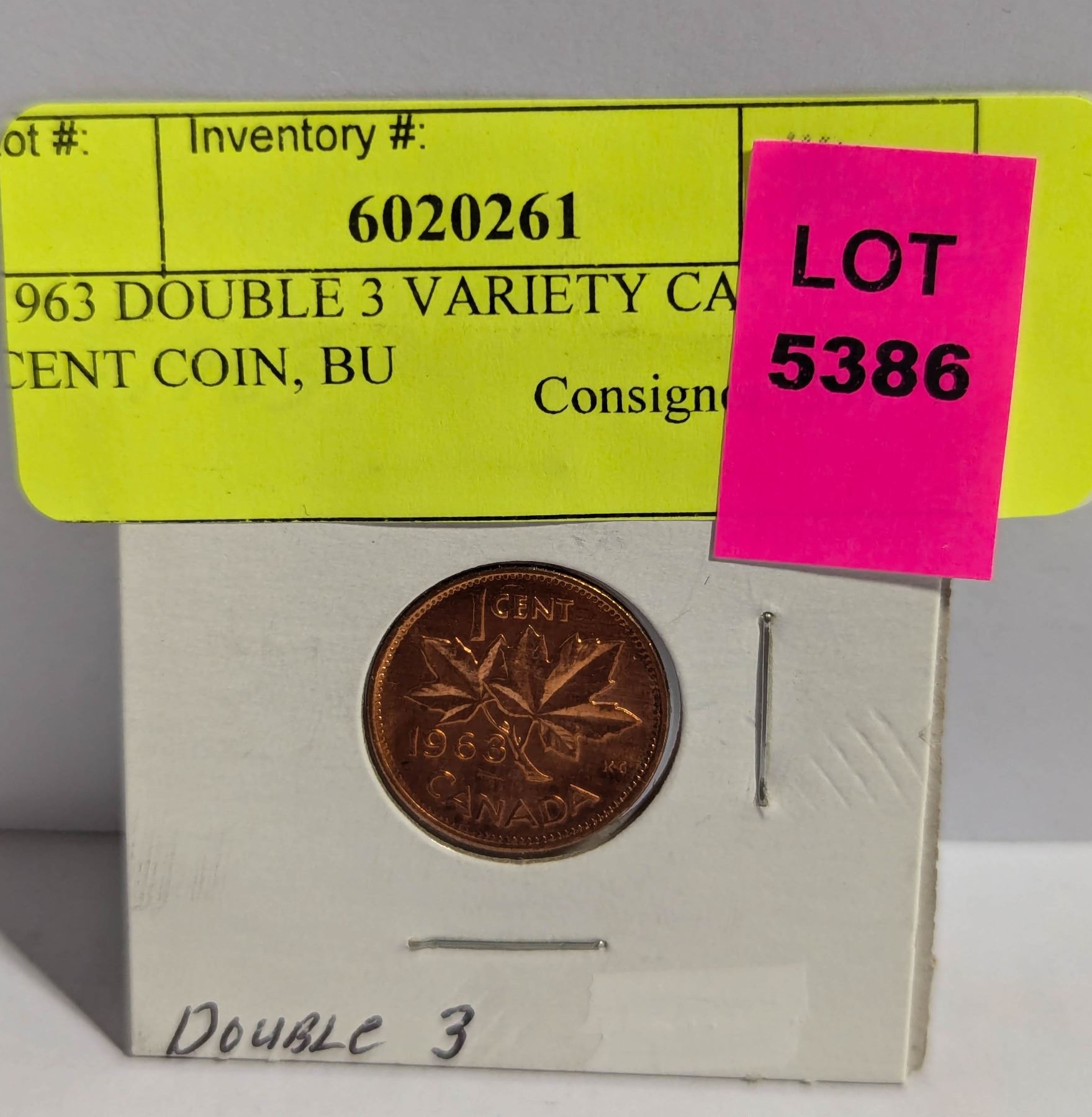 1963 DOUBLE 3 VARIETY CANADA 1 CENT COIN, BU