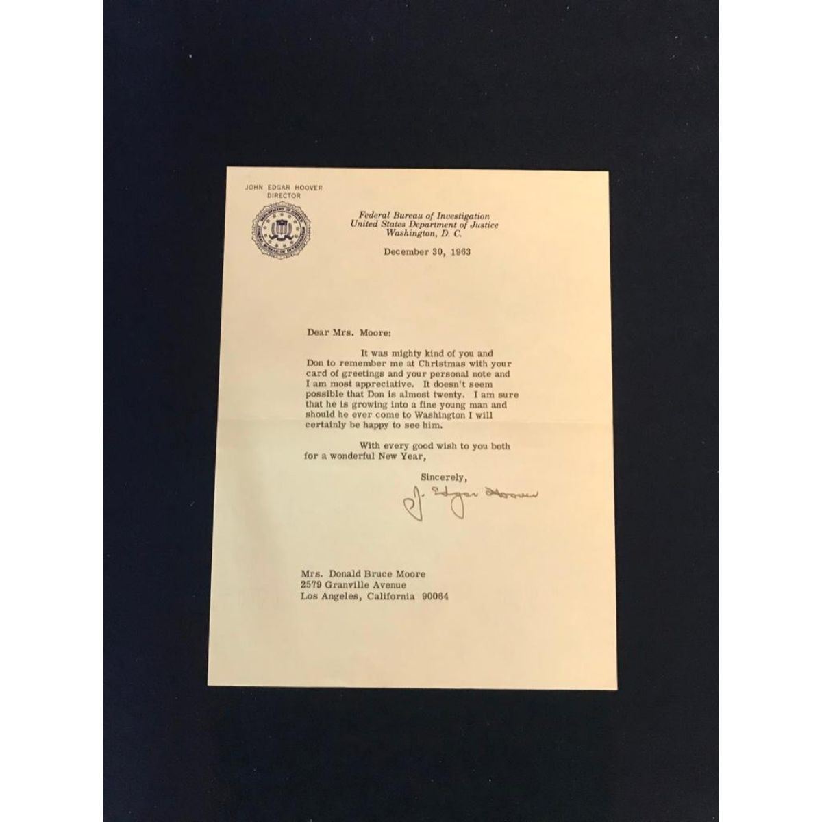 Typed letter on John Edgar Hoover, FBI Washington DC stationary, dated December 30, 1963. Letter sent to the mother of a young man named Don, thanking her for the Christmas card sent. J. Edgar Hoover signature at bottom. Under glass in vintage metal frame.