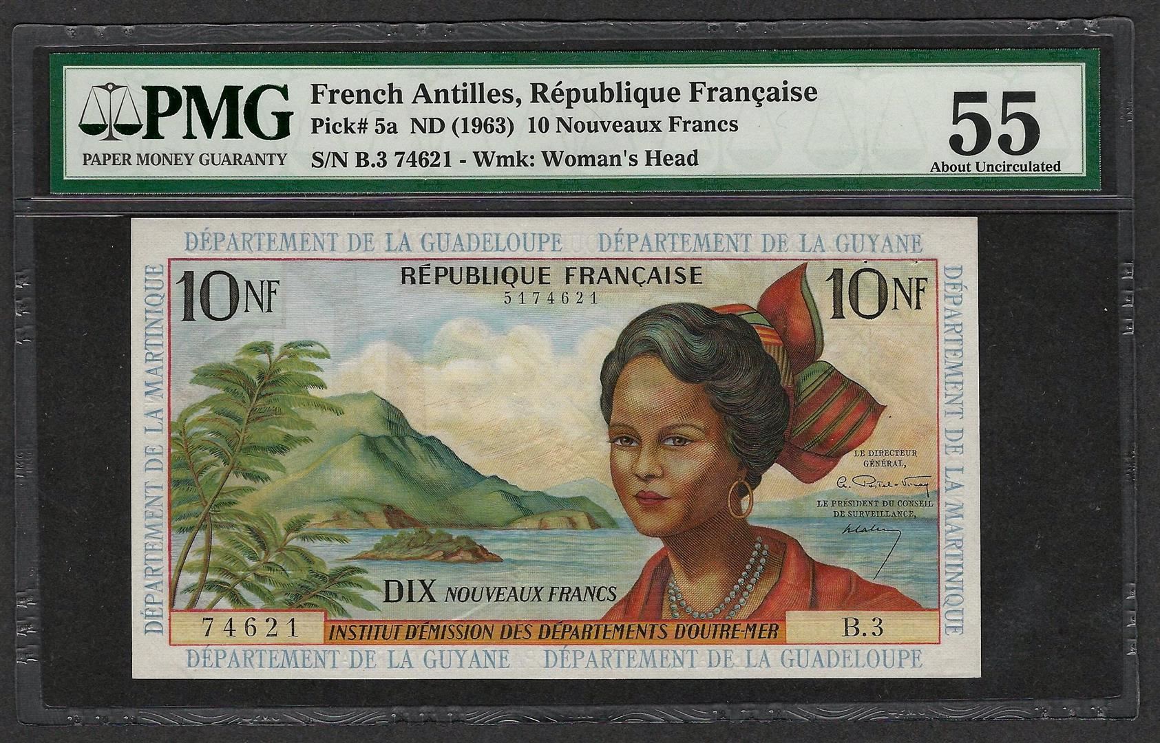 One 1963 French Antilles 10 Nouveaux Francs Note Pick# 5a PMG About Uncirculated 55. PMG Certified.
