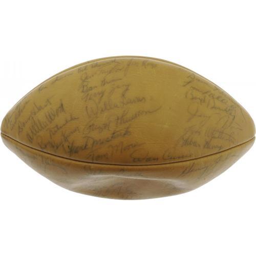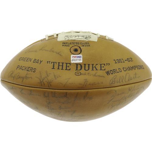 "<B>1963 Green Bay Packers Team Signed Football.</B></I> ""Winning isn't everything, it's the only thing,"" once claimed Hall of Fame coach Vince Lombardi, and one does not make such a bold pronouncement without an established history of winning ways. And as the stamping on this Official NFL ""The Duke"" football notes, the men who patrolled the icy turf of Lambeau did indeed notch consecutive World Championships in 1961 and 1962, establishing this squad as one of the game's great dynasties. This is essentially the identical squad to those legendary Championship teams, plus future Packer greats like rookie Marv Fleming! Assembled here are the signatures of forty-six men who came close to making it a trifecta, most notably Lombardi himself, Starr, Jordan, Wood, Adderley, Davis, Nitschke, Ringo, Taylor and Gregg. That's an even ten Canton inductees! Signature quality holds steady at a consistent 8/10, with all readily legible and unmistakable. The ball derives from the personal collection of team member Frank Mestnik, whose name is penned on a piece of vintage white tape affixed just below the ball's lacing. <I>LOA from PSA/DNA.</B></I> "