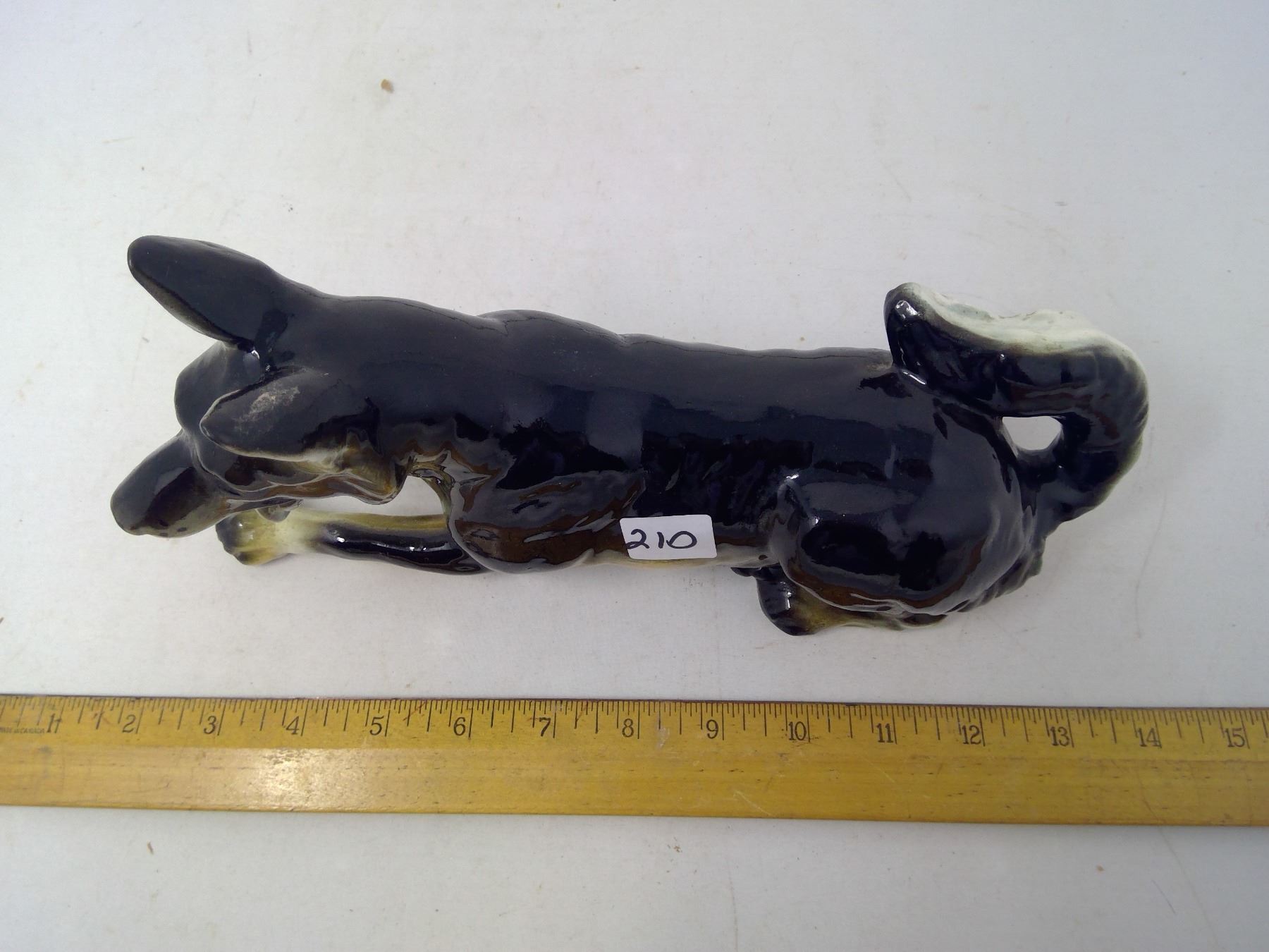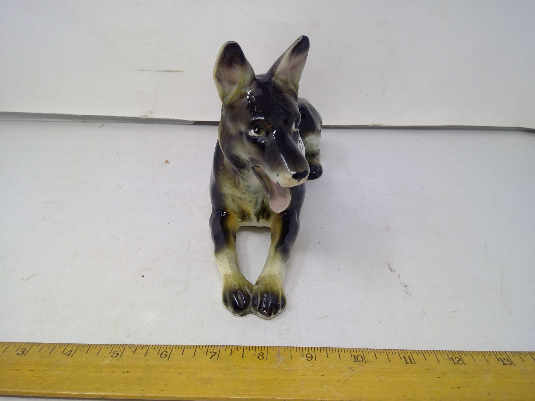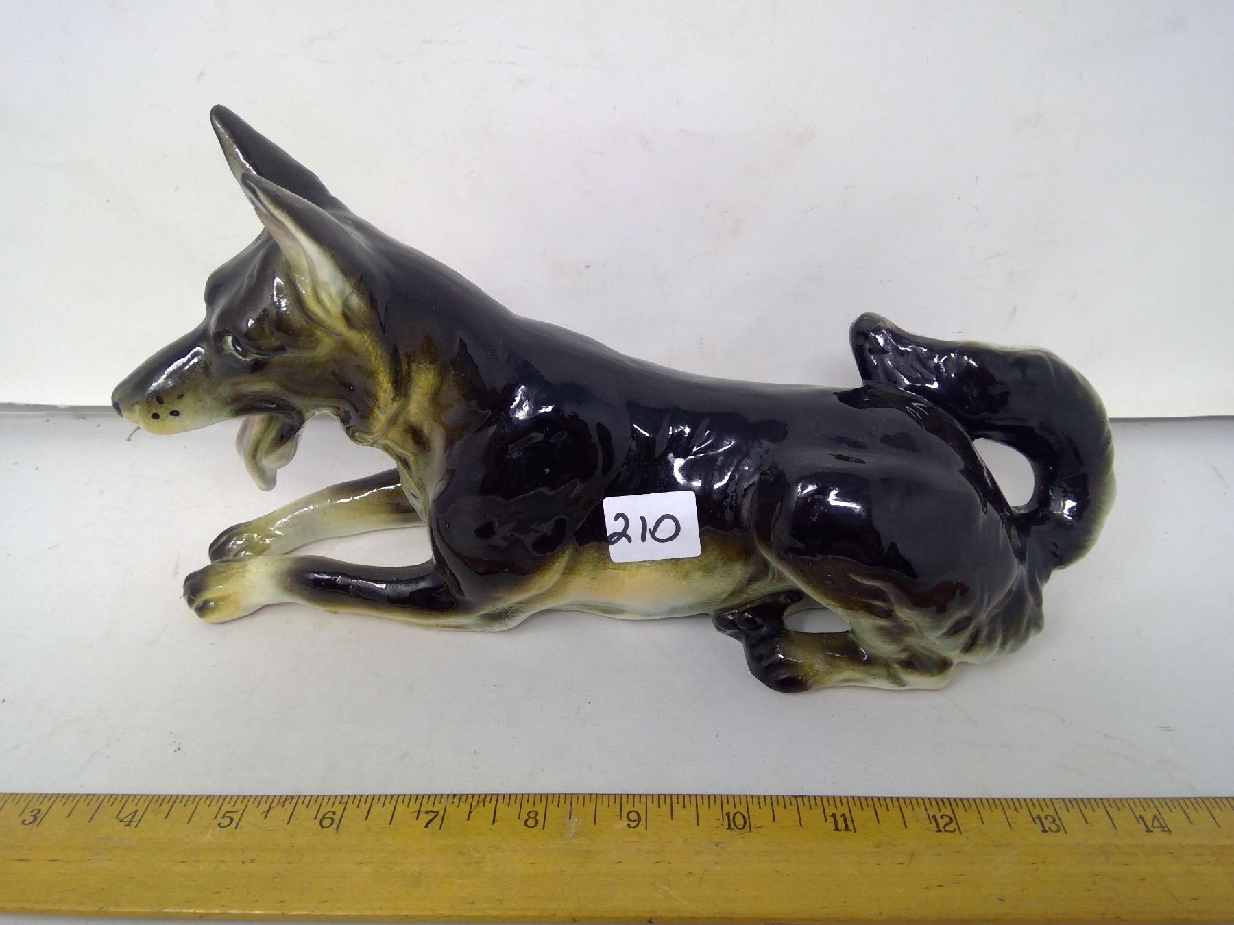 210 1963 Japan glazed and painted porcelain German Shepherd. Length: 11”