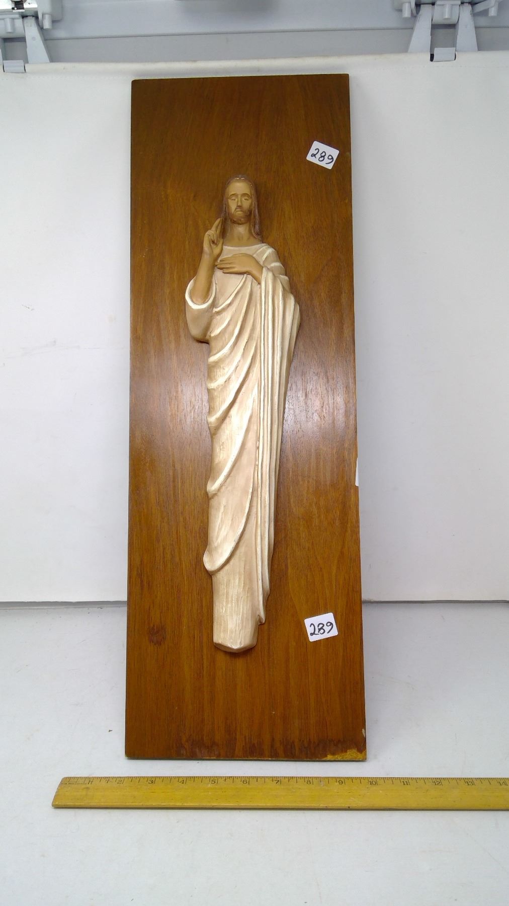 1963 Jesus Figure on Walnut Wood Panel - 24"x8"
