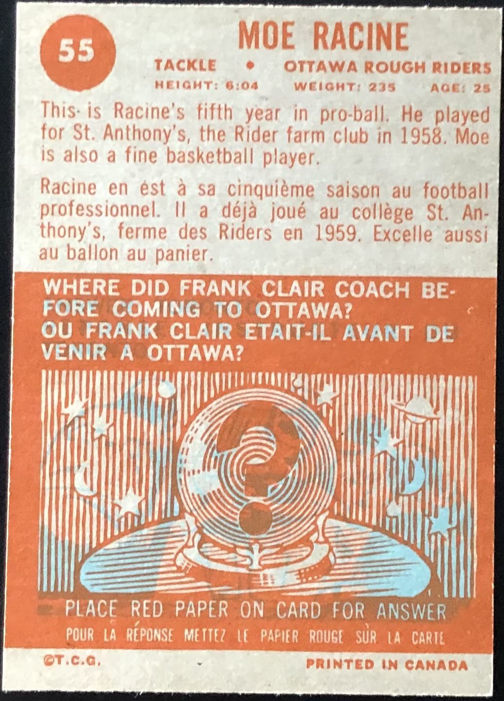 Card #55 vintage, CFL, OPC, football, hall of fame