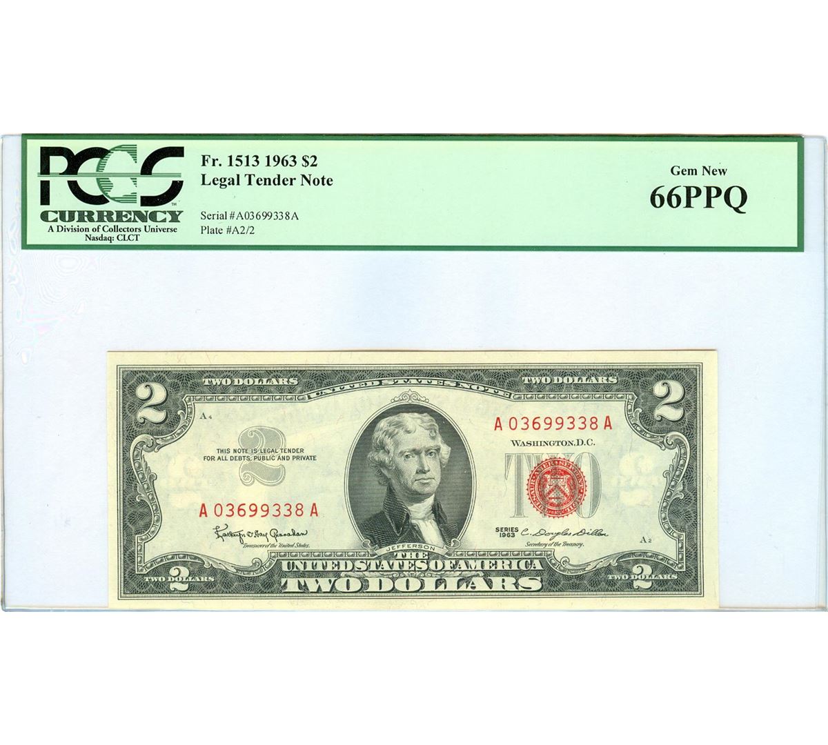 One 1963 PCGS GN66PPQ $2 Red Seal Legal Tender Bank Note.