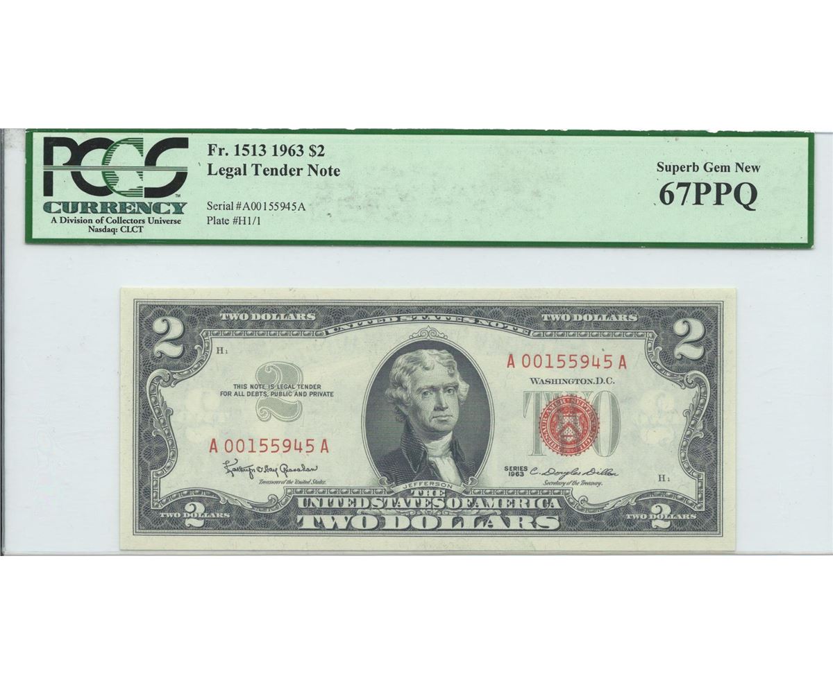 One 1963 PCGS SGU 67PPQ $2 Legal Tender Bank Note. PCGS Certified.