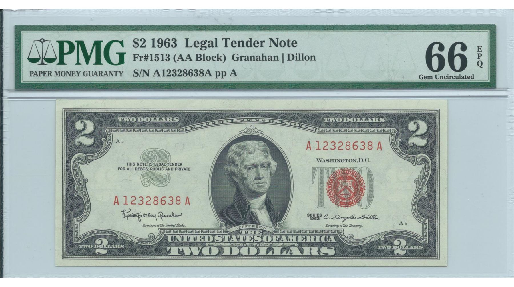 One 1963 PMG GU 66EPQ $2 Legal Tender Bank Note.